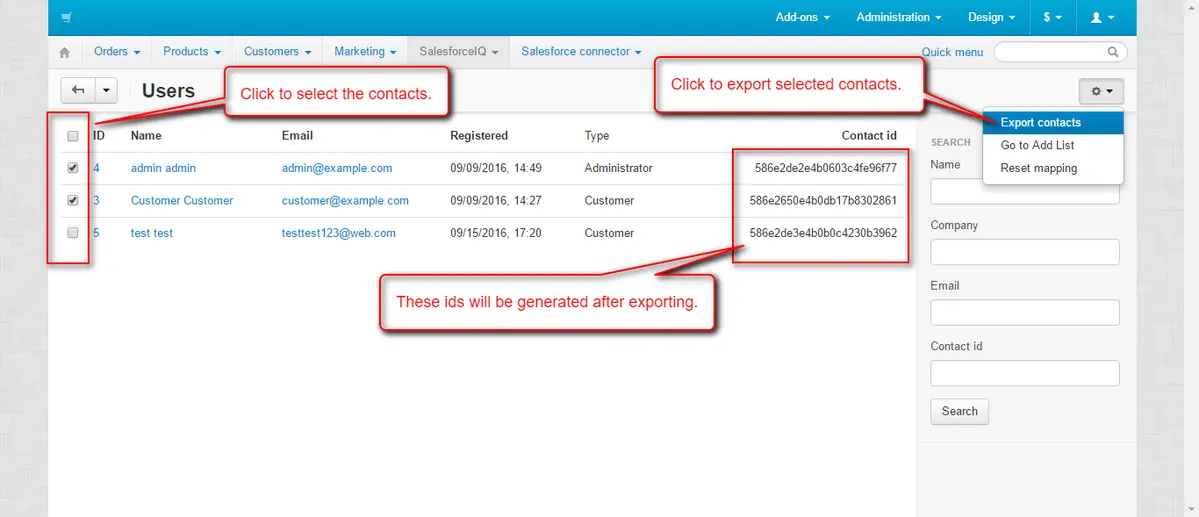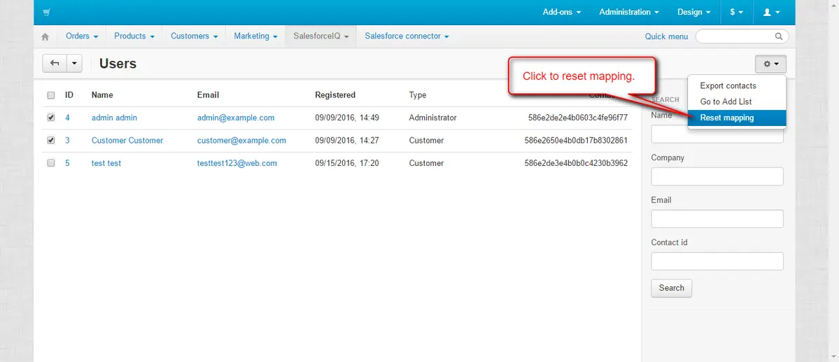 - Qualsiasi numero di utenti può essere importato da CS-Cart a SalesforceIQ.