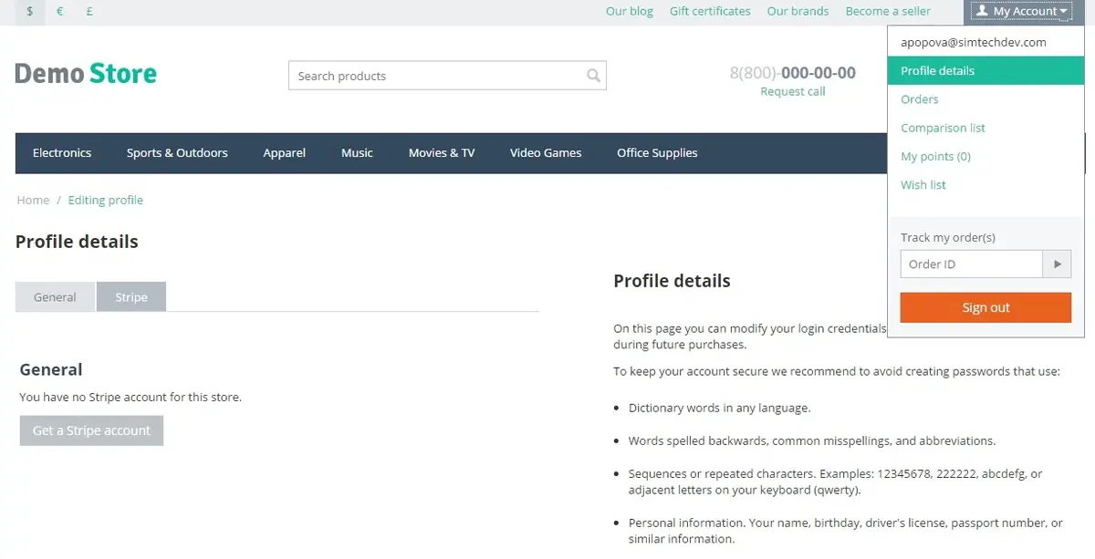- L'acquirente ha la possibilità di creare un account Stripe per il proprio negozio direttamente nella pagina delle impostazioni nel profilo, che consente all'utente di salvare i dettagli della carta per pagare rapidamente tramite Stripe al momento dell'ordine.