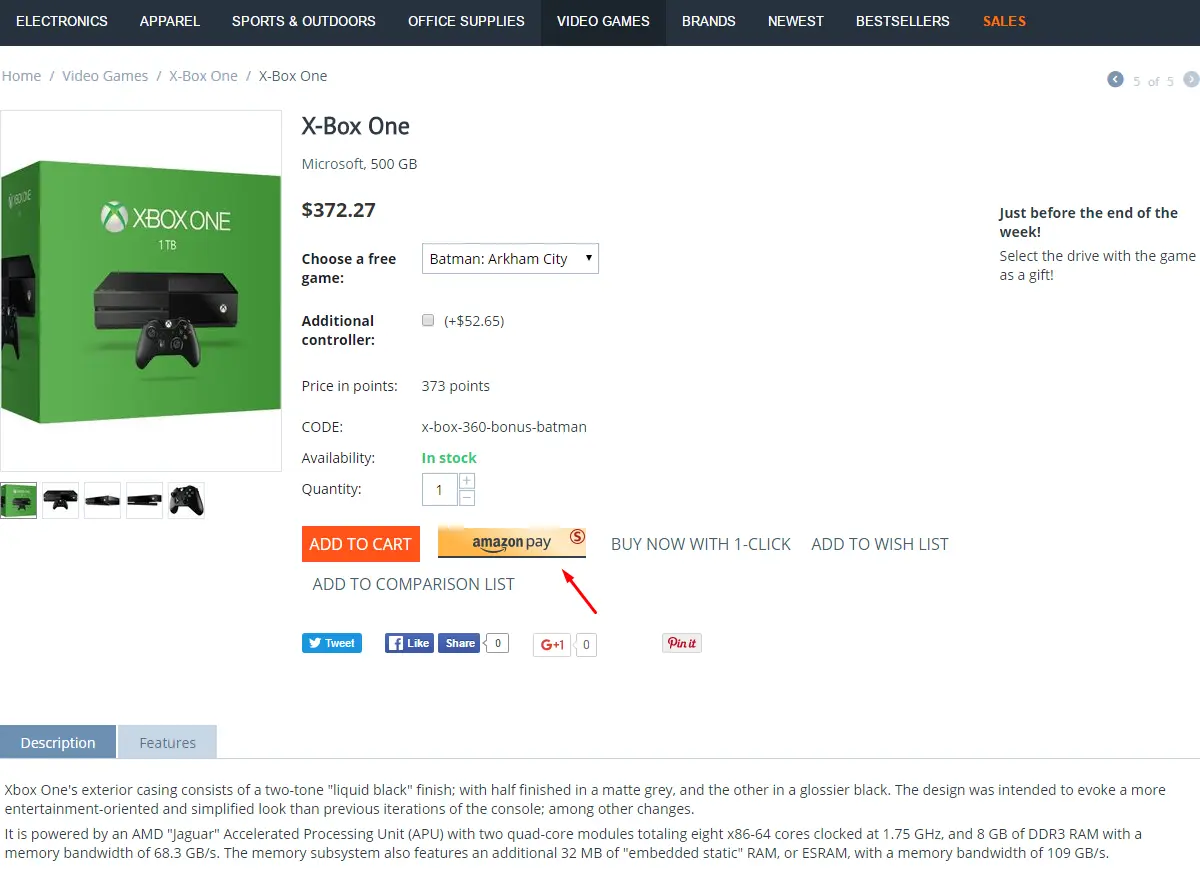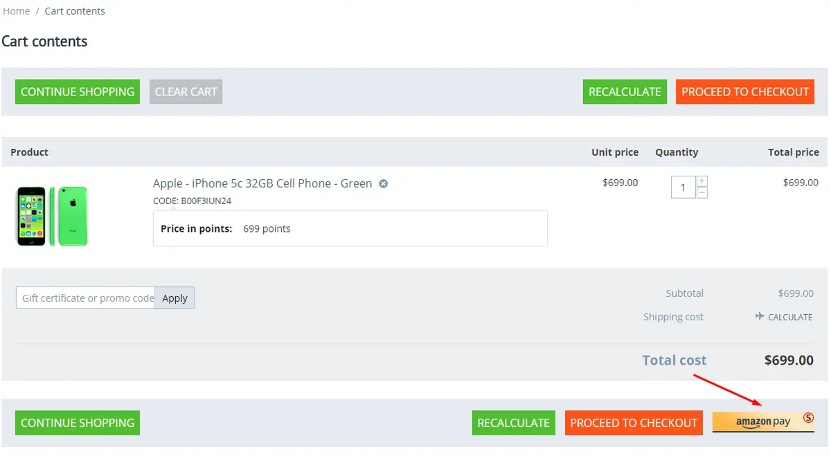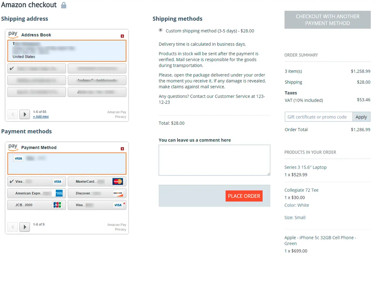 L'opzione Amazon Pay rende i tuoi clienti estremamente soddisfatti della loro esperienza di acquisto senza interruzioni. Al momento possono accedere e acquistare nel tuo negozio online utilizzando le informazioni del loro account Amazon. Gli utenti del negozio scelgono semplicemente un prodotto, fanno clic sul pulsante Amazon Pay e pagano l'ordine. Non devono inserire le informazioni di pagamento o spedizione. È preso dai loro account Amazon.